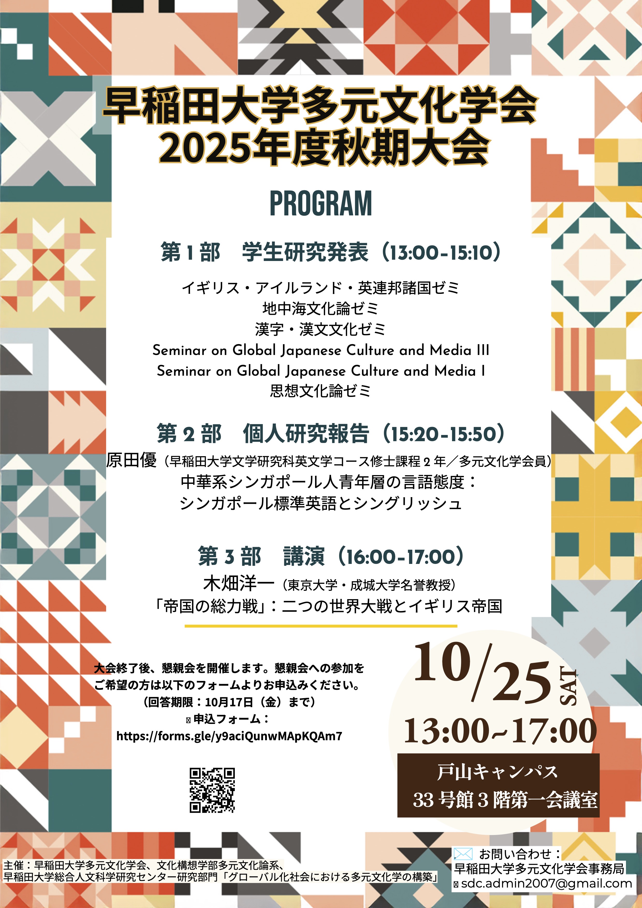 2025年度多元文化学会秋期大会を、10月25日(土)に33号館3階第1会議室で行います。